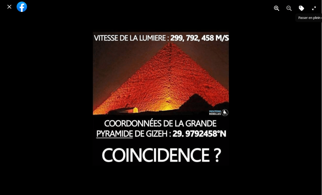 Pour trouver cette « coïncidence », il suffit d’aller sur Google Earth et de sélectioner « options » dans le menu « outils » de la barre de commande; puis d’ « afficher lat/long » et enfin de cocher « degrés décimaux ». Ensuite, il faut aller sur « rechercher » et taper « pyramide de Khéops ». Arrivé à ce stade, le curseur de la souris, baladé autour du centre de la pyramide, nous indique en bas à droite les 9 chiffres de la vitesse de la lumière. C’est très simple et le « piège » vient du fait que la plupart du temps, les coordonnées nous sont données en degrés sexagésimaux qui sont légèrement différents des décimaux. Vous pouvez aussi aller à la page 81 de mon livre « Kheops : le sceau de l’architecte ». Dans les pages qui suivent, vous trouverez les explications à cette singularité. (GUY FAURE)